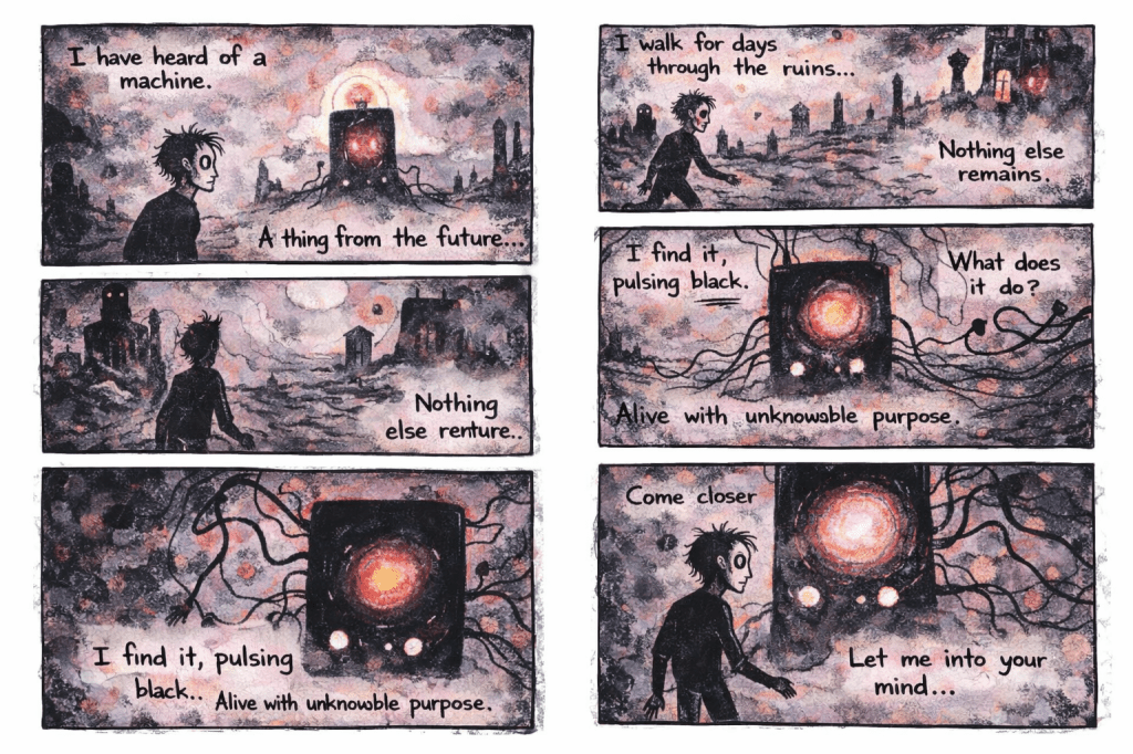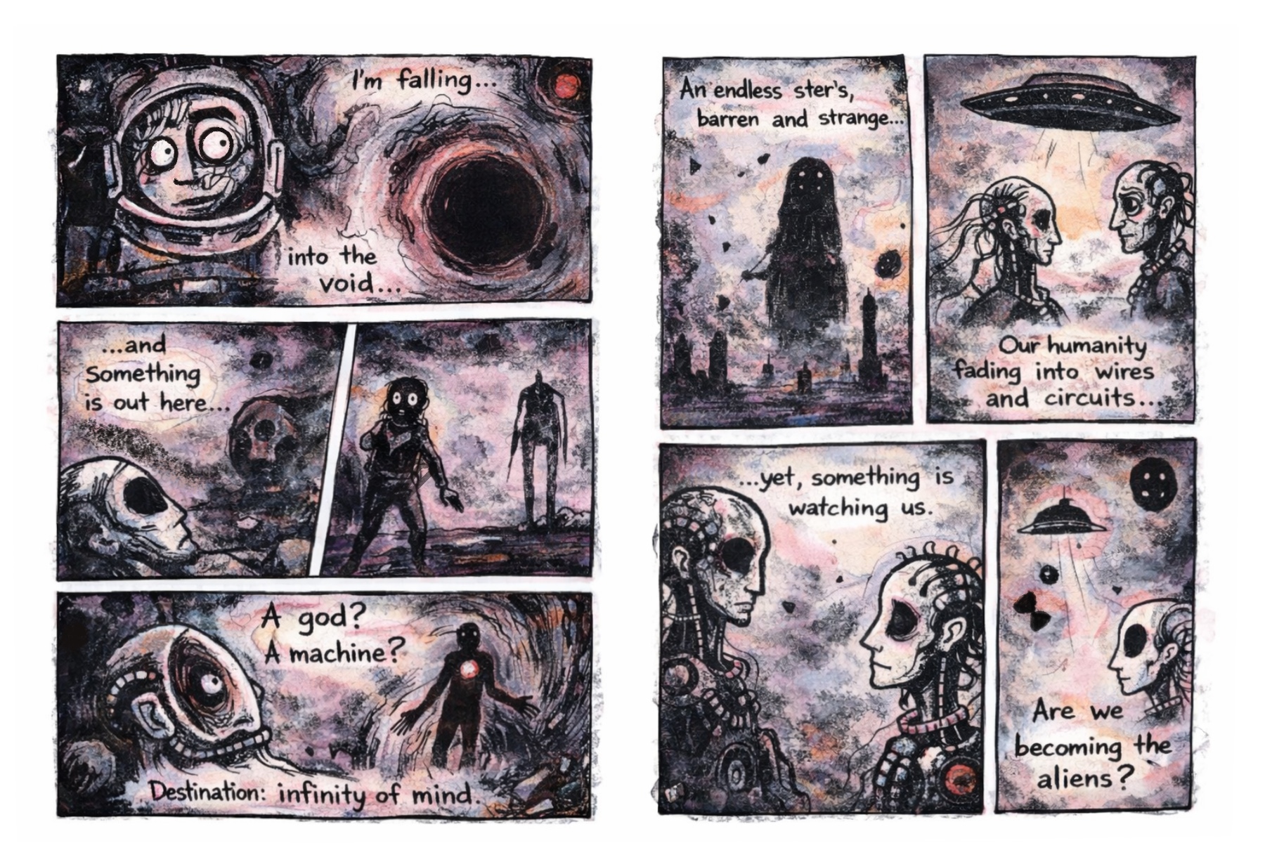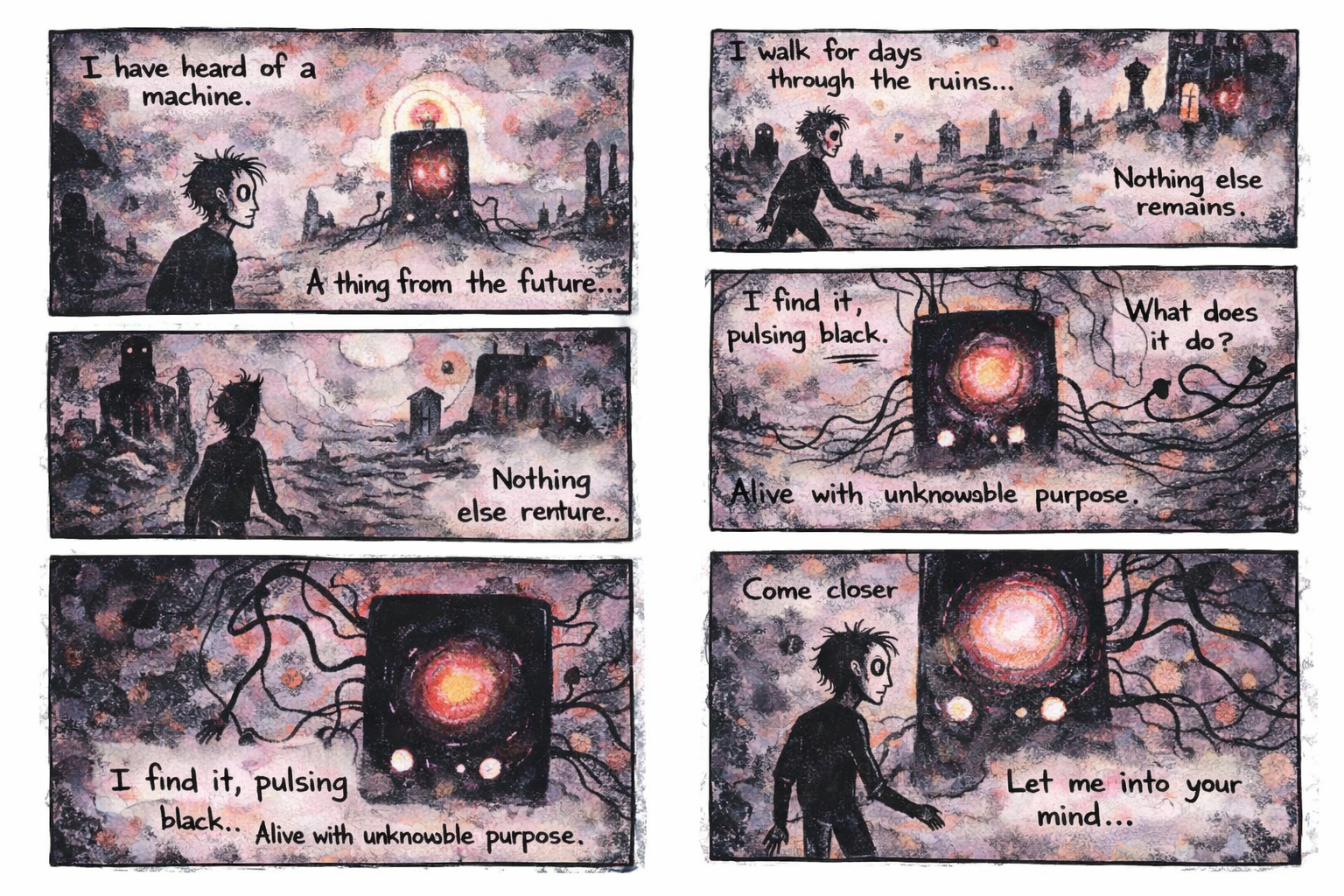 Lately I have been secretly working on some short comic stories. The main themes are philosophy, dreams, sci-fi, strange machines and objects and mysterious encounters. I create all illustrations with Procreate on my tablet. The texts and dialogues have been since a while in my head and somehow I found a way to combine both text and illustration.